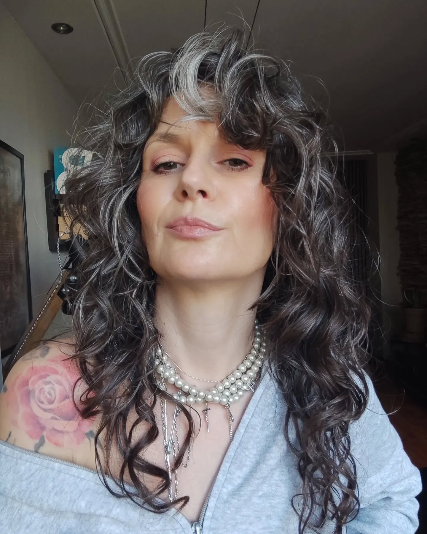 This style blends medium-length curls with soft gray highlights for a graceful and modern look. The shag cut adds volume and movement without feeling too heavy. It’s a great way to embrace natural changes in your hair. You’ll look effortlessly elegant every day.