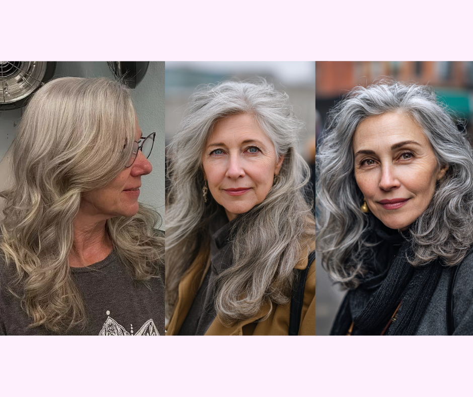 This hairstyle feels familiar in the best way, like hair that belongs to real life rather than a salon chair. The natural gray flows easily through the length, softened by subtle lowlights that quietly add dimension without announcing themselves.
