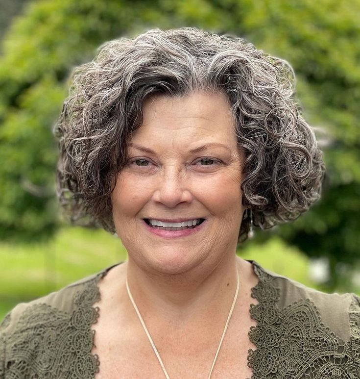 A short curly bob with fringe is the perfect face-framing haircut for women over 60. This layered cut allows the curls to have lots of bounce and volume. It is very low-maintenance and great if you are looking to wash and go.