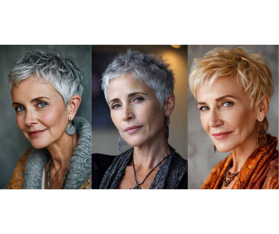 A neat, cropped silhouette with lightly feathered fringe softens the face and lets natural grey read modern and elegant. It’s low maintenance because pixies need minimal heat, air‑dry well, and keep shape with simple 4–6‑week trims and an easy, flexible fringe.