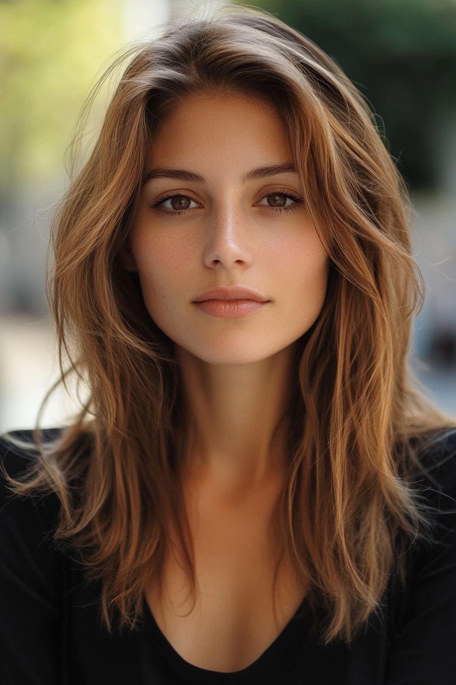 A middle part with light brown hair and highlights creates a clean, balanced style. The highlights add depth and lightness, making your hair look fuller. It’s a simple way to update your look with elegance. You can wear it straight or wavy.
